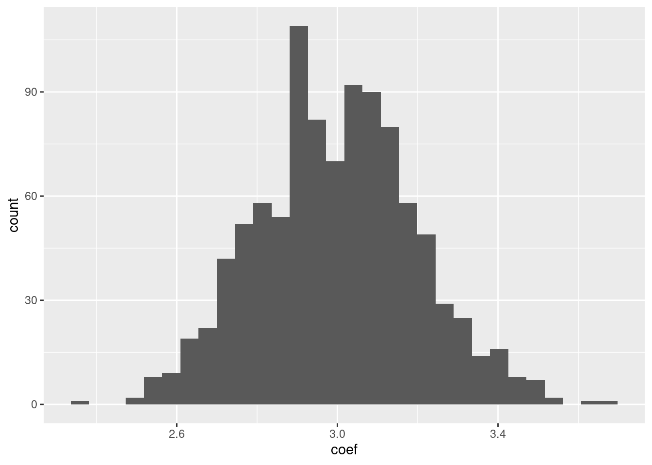 coefficients <-map_dbl(1:1000, ~ { epsilon <-rnorm(n=50, mean=0, sd=2) x <-runif(n=50, min=0, max=5) y <- x*beta + epsilon # Remember, true beta is still 3 df <-tibble(x=x, y=y) reg <-feols(y ~ x, data = df) estimated_beta <- reg$coeftable$Estimate[2]return(estimated_beta)})# Plot the resulttibble(coef=coefficients) |>ggplot(aes(x=coef)) +geom_histogram()